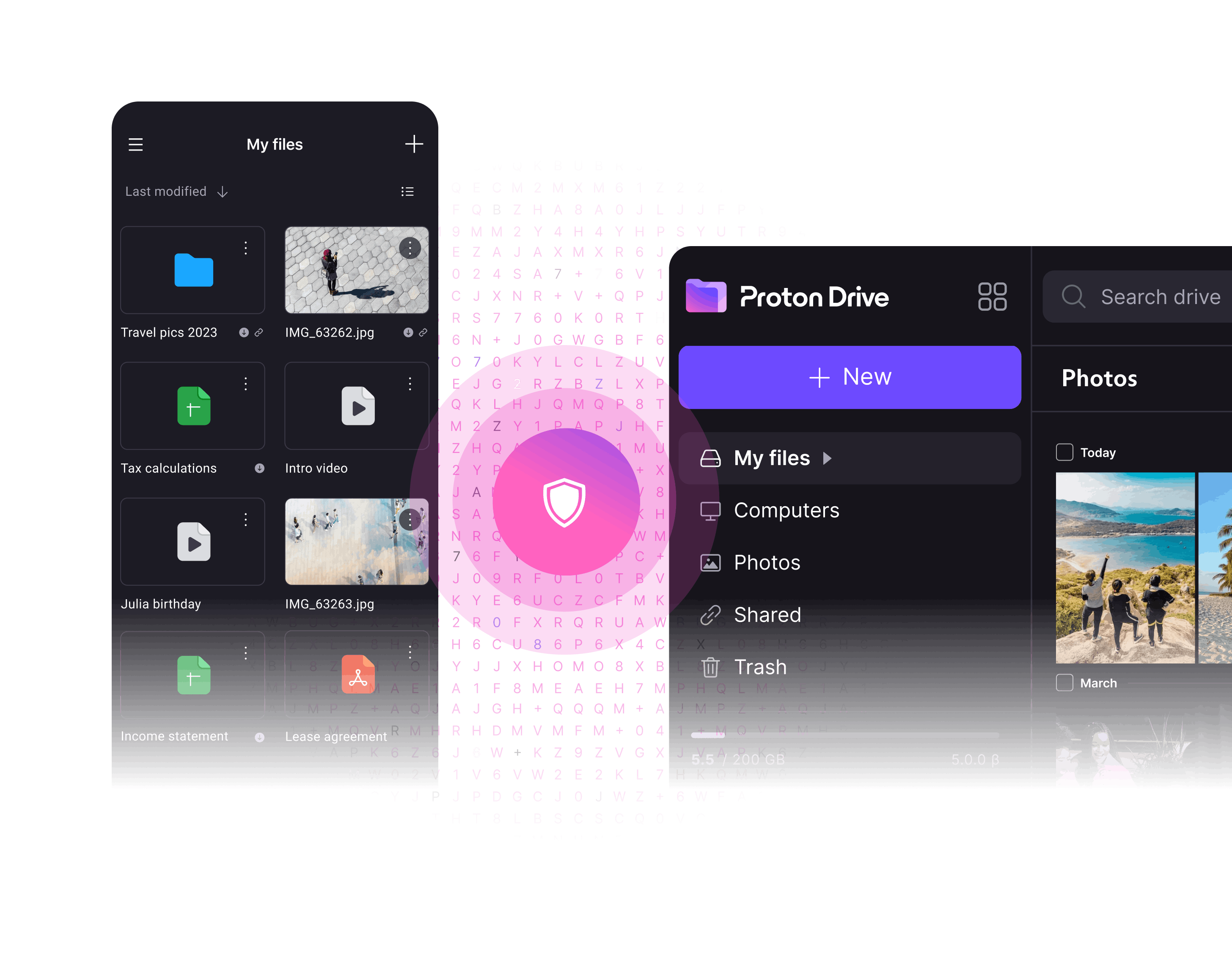 All files in Proton Drive are end-to-end encrypted, but our unique encrypted search technology makes searching for encrypted files possible.