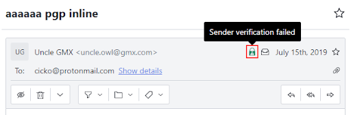 If you are using the Address Verification with Trusted Keys feature, then Proton Mail will notify you if a digital signature check fails via the “Sender Verification Failed” error message. This article provides more details about what this message means.
