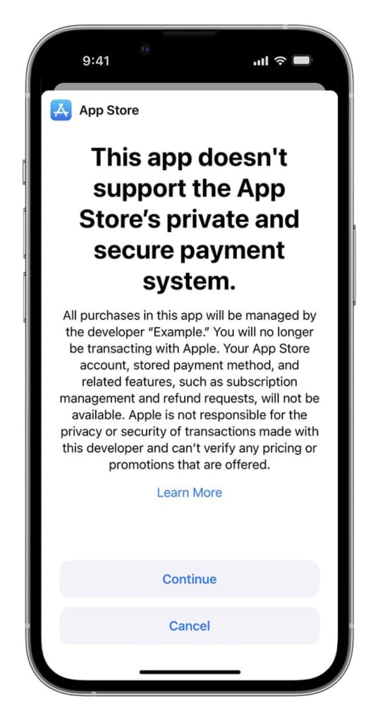 If you decide to use anything other than Apple’s in-app purchase system, you’re forced to display a “scare screen” designed by Apple, which you cannot modify.
