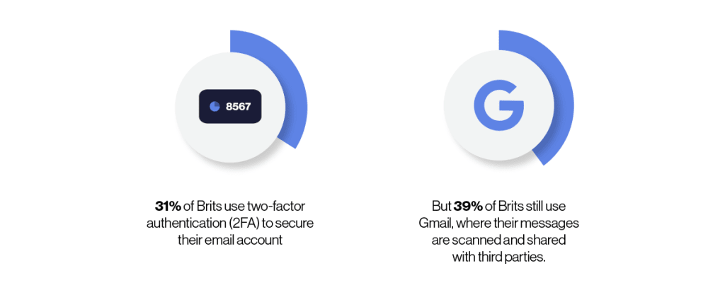 Nearly one-third (31%) of Brits use two-factor authentication (2FA) to secure their email account, but if you are one of the 39% of Brits that use Gmail, your messages will still be scanned and shared with third parties. Only 9% of Brits are comfortable with the idea that their email contents could be scanned, yet 82% of Brits use email services that do just that.
