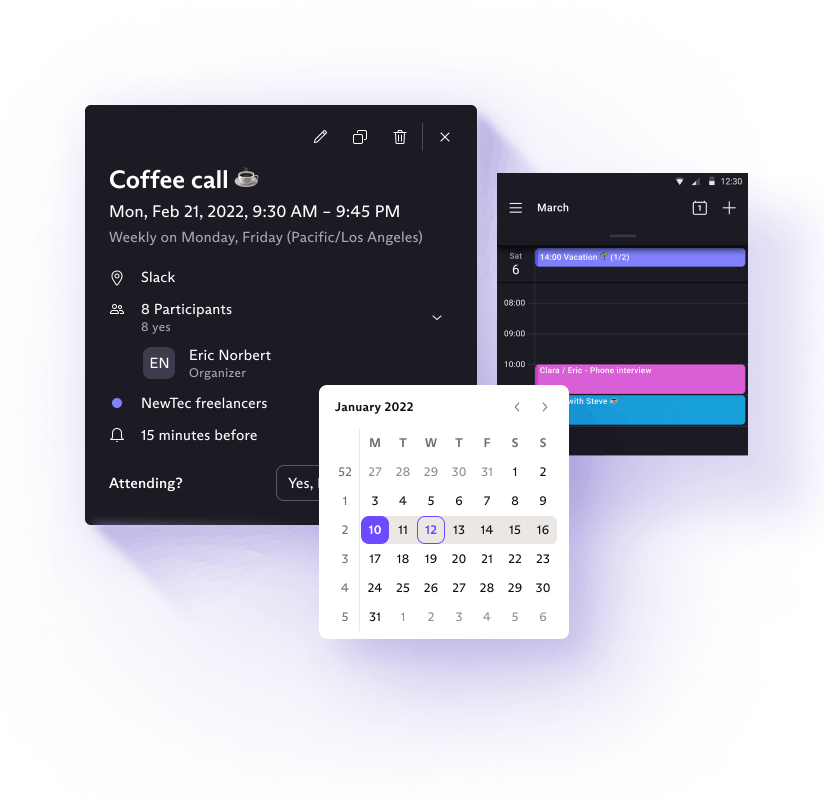 Proton Calendar is a calendar that respects privacy and puts people (not advertisers) first. Your data belongs to you, and our encryption ensures that.