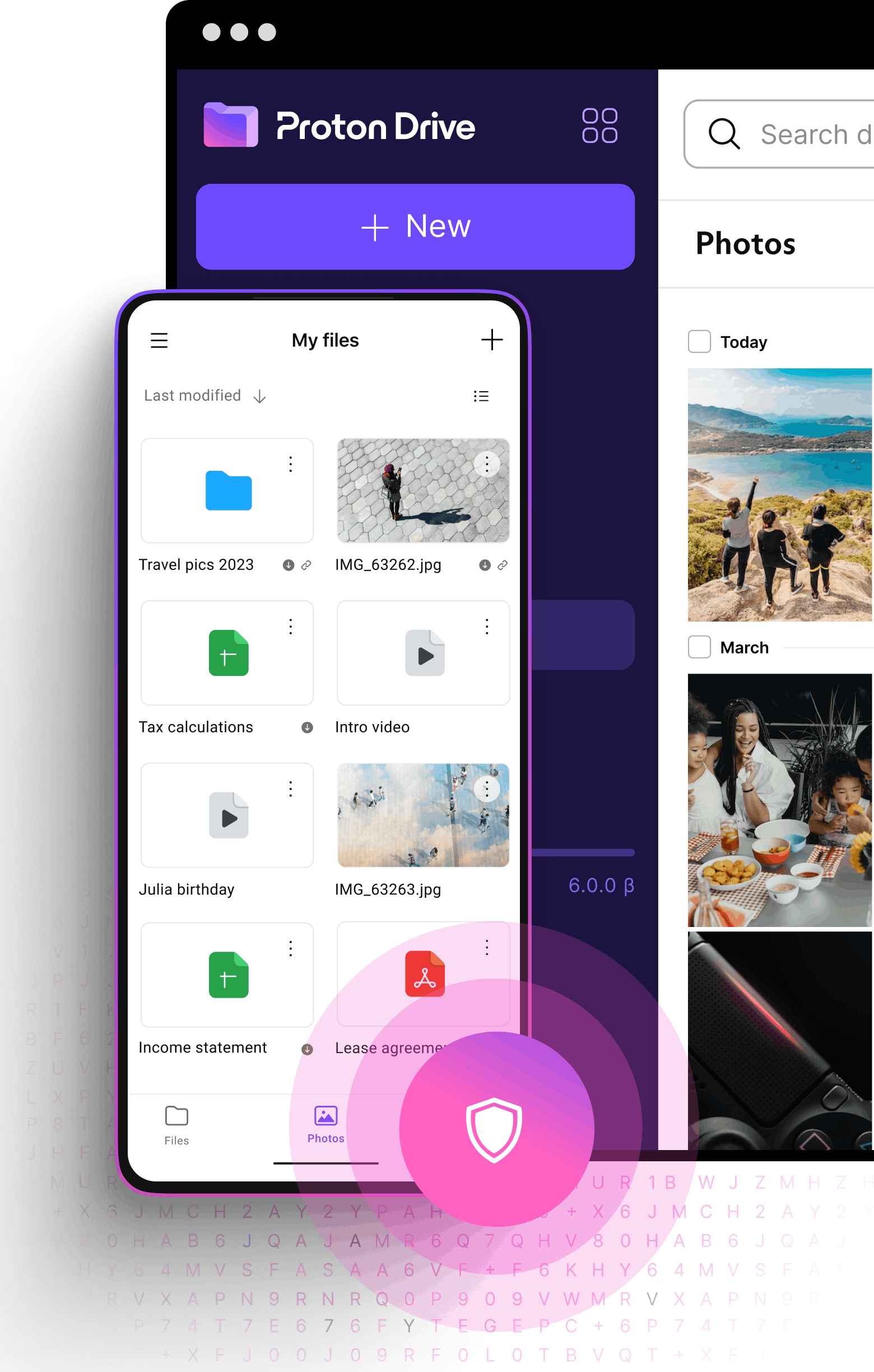 All files in Proton Drive are end-to-end encrypted, but our unique encrypted search technology makes searching for encrypted files possible.