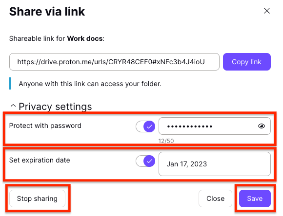 You can share files and folders from Proton Drive with anyone using secure shareable links. These links are generated locally in your browser, so Proton never has access to your files or folders.