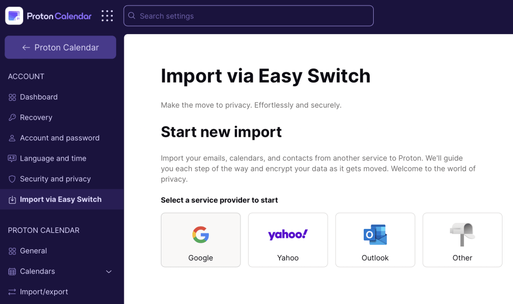 You can use Easy Switch to quickly import events from Google Calendar to Proton Calendar on the web and the Android app. Your events are automatically end-to-end encrypted so no one else can access them. You can also import your calendars from other calendar providers using an ICS file.