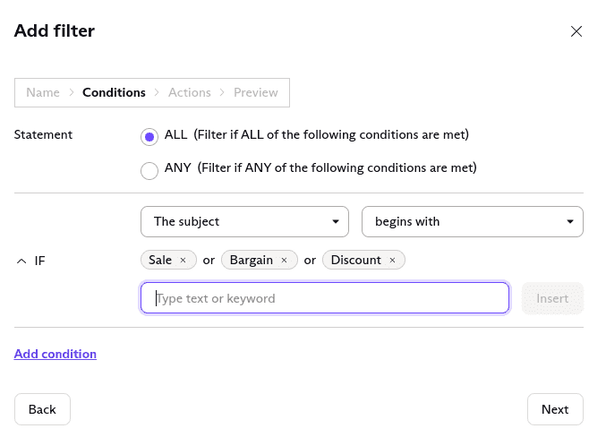 5. Add the conditions that will activate the filter. You can choose to activate the filter only when certain requirements are met, or when all requirements are met.