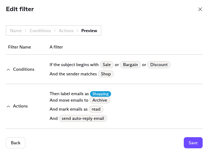 9. Select Preview to see an overview of the filter you have created and click Save to create the filter.