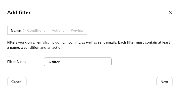If you have a paid Proton Mail plan, you can create an unlimited number of custom filters with up to 100 active filters at a time. If you are on our Free plan, you can also create as many filters as you like but can only have one active filter at a time.