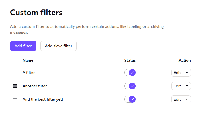 Filters are sets of rules that allow you to organize your Proton Mail inbox and custom folders. In this article, we show you how to create simple custom filters.