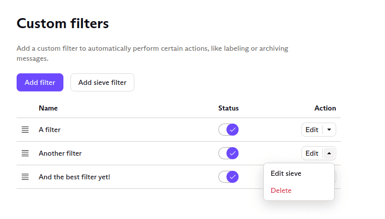 1. To manage your filters, sign in to your account mail.proton.me(new window) and select Settings → All settings → Proton Mail → Filters → Custom filters.