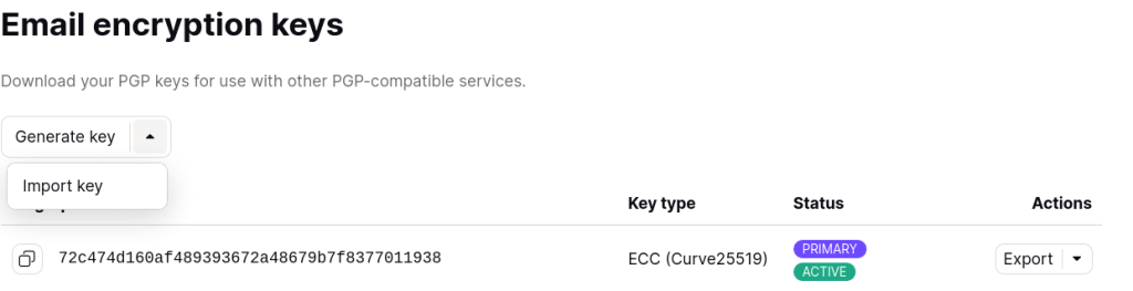 - Select the email address associated with the key in question, click the dropdown menu that says Generate key, and click Import key.
