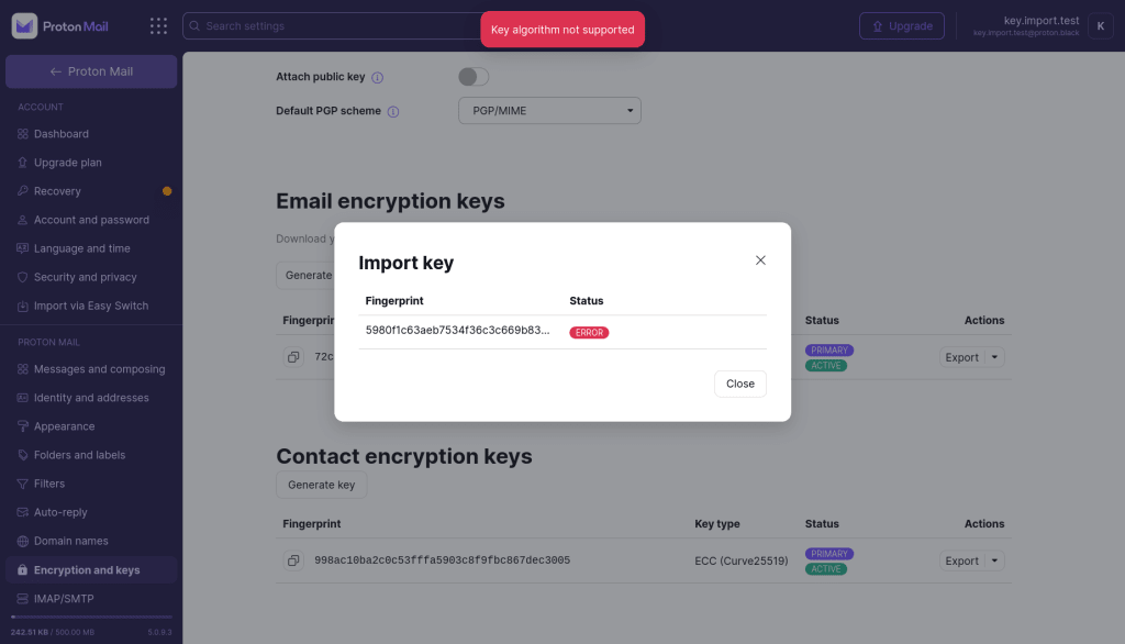 The keys you import must meet Proton’s minimum key requirements for security and compatibility reasons.