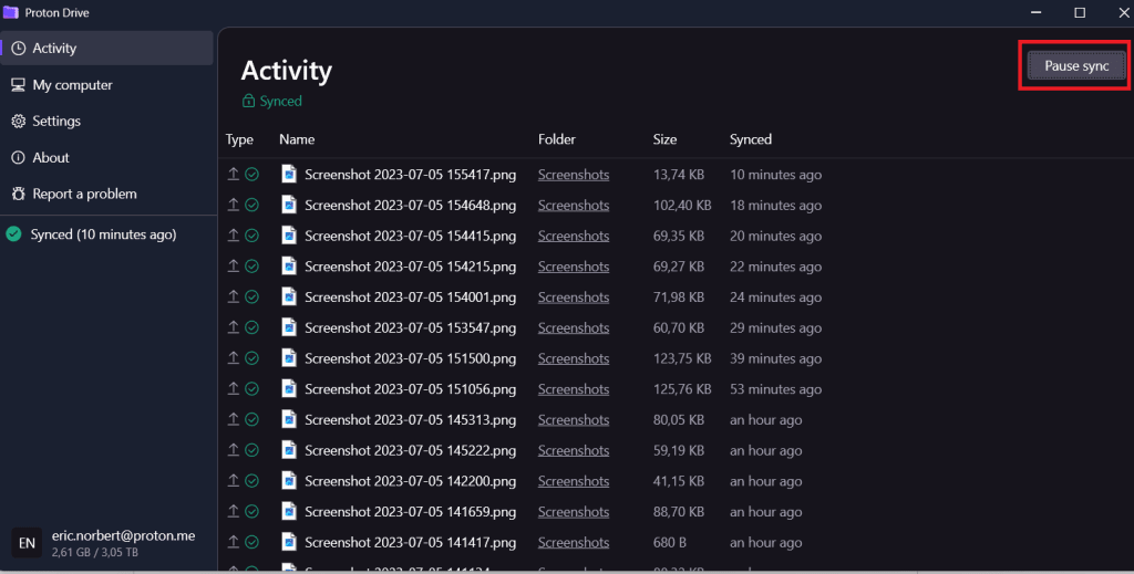 To successfully sync these files, make sure these are set to Always keep on this device. This should now allow the file to be synced to Proton Drive. - Sync not working or taking too long – This can usually be fixed by pausing and resuming sync from the Activity tab of the Windows app.