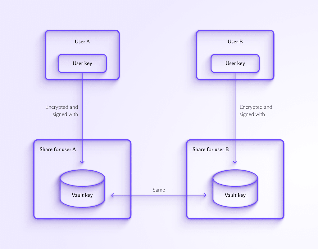 The user key is used to open all shares you can access, meaning it must be secured. The bcrypt password hashing implementation used by Proton Pass is more robust and secure than PBKDF2, which has led to breaches in other password managers.