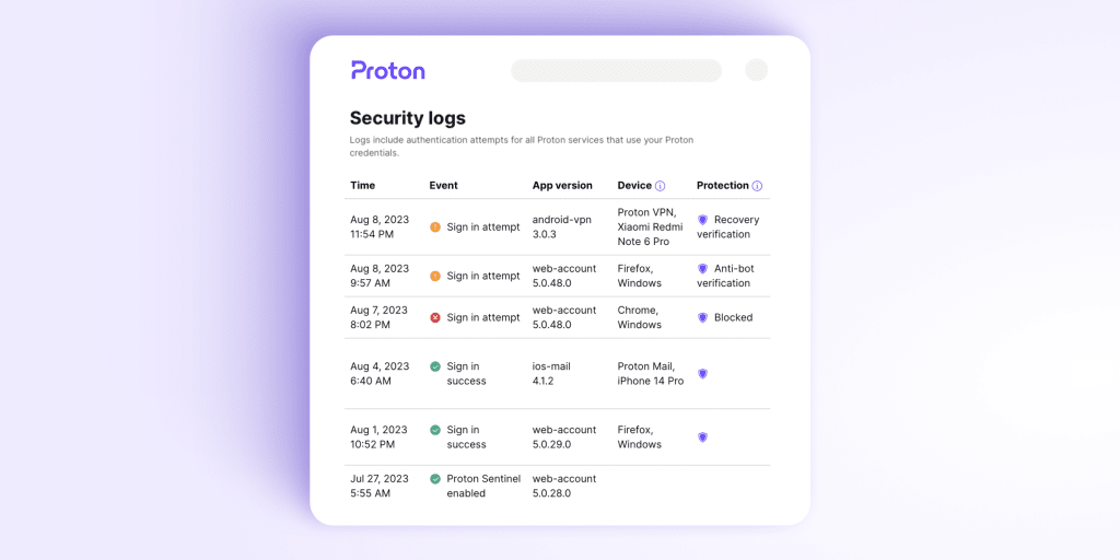 Finally, we believe users are the ultimate guardians of their security, so Proton Sentinel users will see more account security alerts and information for self-monitoring. Important events in security logs, such as logins and account changes, will have a new column called Protection, showing any defensive actions our systems took. There will also be other useful information, such as the operating system and device that triggered the event.