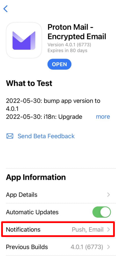 2. Tap Proton Mail (not the OPEN button), or whichever app you’re testing.