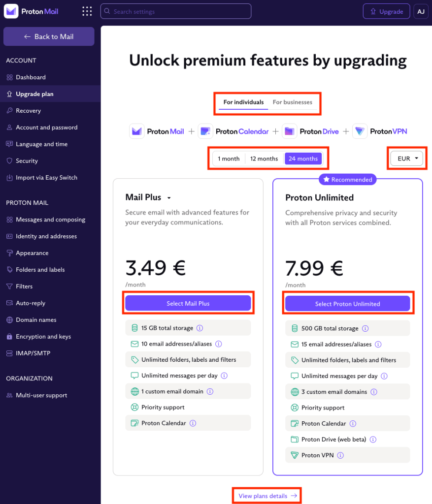 1. Log in to your Proton Account at account.proton.me and click Settings → All settings → Dashboard → Your plan. Click Explore other Proton plans.