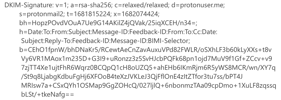 A DKIM signature is a digital signature that’s added to an email header(new window) to allow the receiving server to verify cryptographically that the message hasn’t been tampered with.