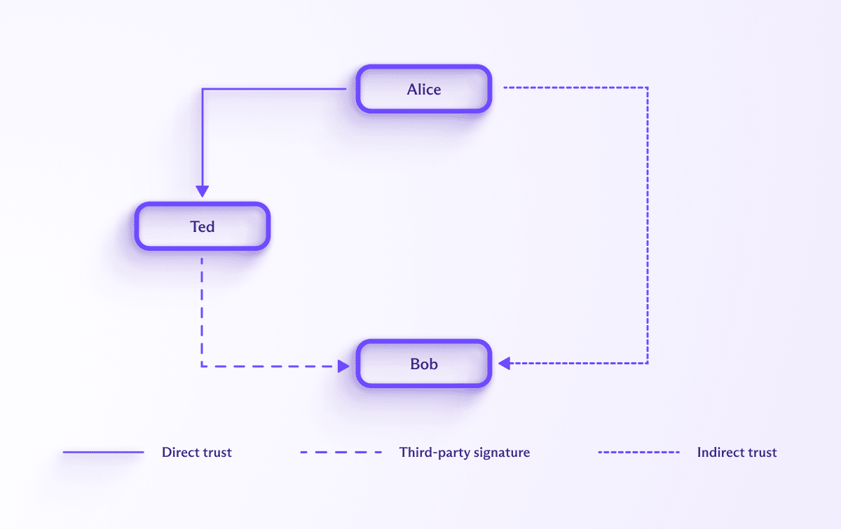 For example, Alice wants to send an email to Bob, so her first step is to retrieve his public encryption key. This downloaded key contains a signature from Ted stating that he certifies this key belongs to Bob. If Alice trusts Ted to correctly verify Bob’s identity, then she indirectly trusts Bob’s key. Ted is the trusted authority in this case, acting as a (very small) CA.