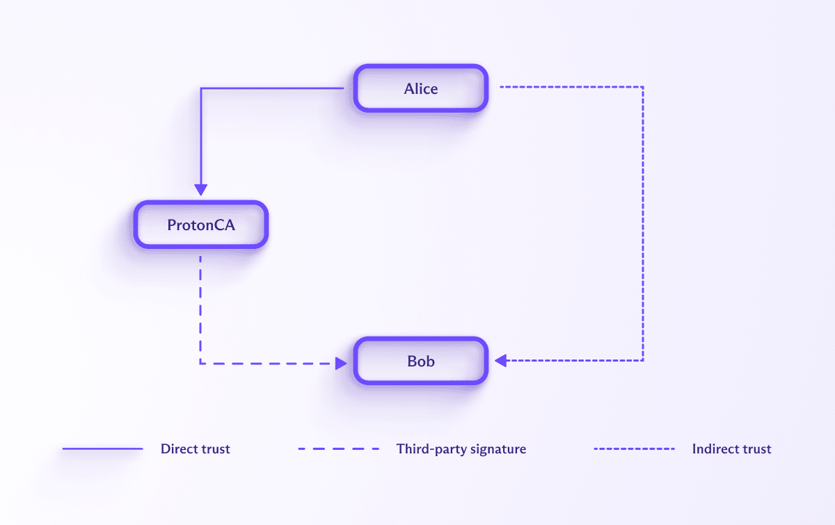 Let’s go back to our original example with Alice and Bob, but let’s replace Ted with ProtonCA. Now, when Alice fetches Bob’s key, she will receive a key with a ProtonCA signature stating that bob@proton.me uses that key. Alice, who might be using an external OpenPGP client, can verify the authenticity of this signature, and if she trusts Proton, she’ll indirectly trust this key automatically. This trust applies regardless of how Alice obtained Bob’s key. Even if she found it on an insecure medium, ProtonCA’s signature makes it tamperproof.